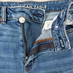 Good condition - Women’s American Eagle Stretch Distressed Mom Short Jean Shorts. Has three front pockets, two back pockets, and two buttons with zipper closure. Color: denim blue. Size: 2.