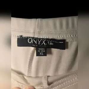 Elevate your wardrobe with these stunning XL Onyx Nite dress pants. The solid white color and wide-leg chiffon overlay with belted accents make them perfect for any occasion, whether it's for travel or just a casual day out. The pants are made of polyester and have a flat front with an elastic waist for a comfortable fit.