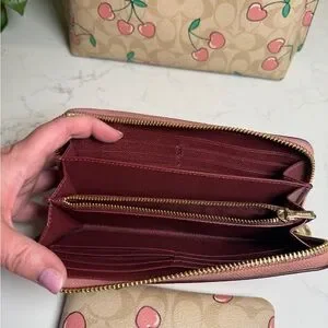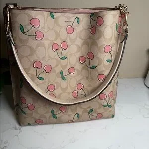 This Coach handbag and 2 wallets showcases a delightful fruit pattern in pink tones against a cream background, exuding a fun and stylish vibe. The pink leather accents enhance its elegance, making it an ideal accessory for those who appreciate a blend of charm and functionality.