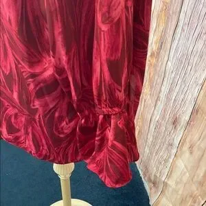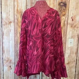 This elegant red blouse features a relaxed fit with ruffled details, adding a touch of sophistication to your wardrobe. The puff sleeves and mandarin collar enhance its stylish appeal, making it perfect for both casual and dressy occasions. Crafted from a silky fabric, it offers a luxurious feel and a lustrous sheen.