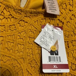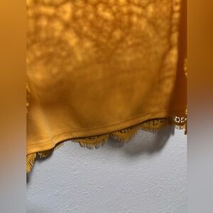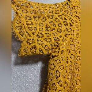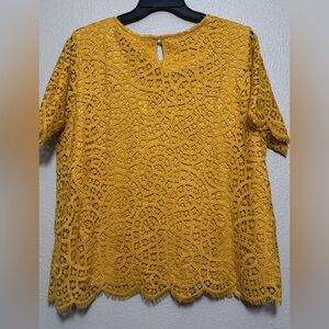 Elevate your style with this Philosophy blouse, featuring a relaxed boxy fit and intricate embellishments. The golden hue adds a touch of luxury, while the delicate lace design offers a sophisticated and airy feel. Perfect for adding a chic flair to any ensemble.