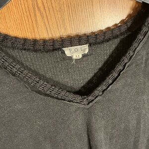 Chic charcoal knit top with V-neck. Features textured neckline. Comfortable and stylish.