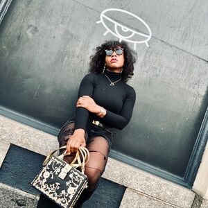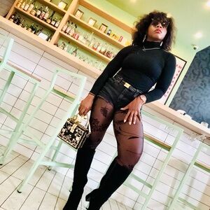 Custom made black floral mesh stockings with elastic waistband and closed foot design. Great to pair with shorts, skirts, dresses and ripped jeans. Model in picture is wearing size m/l.