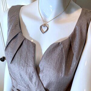 Adrianna Papell sleeveless cocktail dress size 12 in a silvery tan with rosette detail. This dress is an understated beauty with its sweetheart neckline, figure-skimming shape in shimmering, silvery tan and floral detail at the gathered waist. I've loved this dress, but it's time to make a little space in my closet for something new.