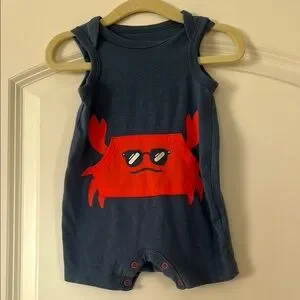Adorable baby romper featuring a red crab with sunglasses. Perfect for a fun day out.