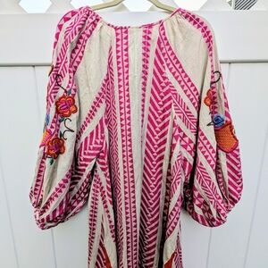 Vibrant maxi dress with bold patterns. Features pink and red hues. Intricate embroidery on sleeves. Perfect for a statement look.