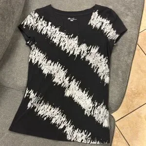 This Kenneth Cole short sleeve tee adds a bold edge to casual wear with its unique white brush stroke stripe pattern on a black base. Made from a soft, breathable material with a flattering, gently fitted shape. Perfect for pairing with jeans or leggings for a stylish laid-back look.