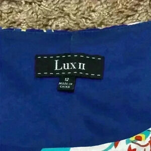 This Luxology dress in size 12 features a blue floral pattern and short sleeves. Made from polyester, it is suitable for casual and special occasions. This dress does have a liner. Designed for women, it is machine washable.