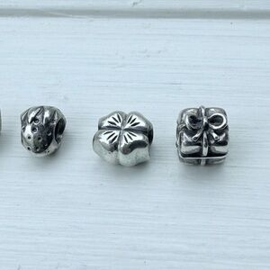 Set of six silver charm beads. Includes floral and gift designs. Perfect for bracelets.