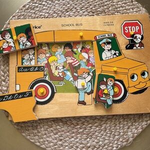 Fisher-Price School Bus Puzzle, featuring a vibrant yellow and black school bus and students. This is a 13 piece puzzle. And Is in very good vintage condition. The back of One puzzle piece pictured with some chips. The front and sides of this piece has not been damaged.