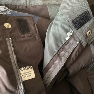Front zipper, snap and Velcro closure. Belt loops. Zipped and Velcro pockets. Powder cuffs.