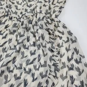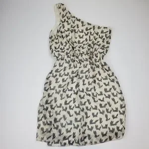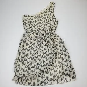 Everly one shoulder cream and grey print dress. Faux wrap style skirt with ruffle. Lined. 100% polyester. Size: S