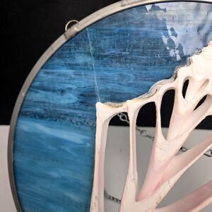 This unique and stunning hanging art piece features lovely, swirling ocean blue stained glass, expertly joined to create a dazzling display when illuminated by natural light. The genuine 3D conch shell sliced cutout, thoughtfully mounted in the center of the circular frame design, adds an authentic touch of coastal charm and a hint of organic texture. Perfect for a sun-drenched window, a tranquil entryway, or as a distinctive wall accent, this one-of-a-kind artwork is a testament to timeless craftsmanship and natural artistry. A true gem for collectors and lovers of vintage seaside decor.