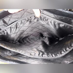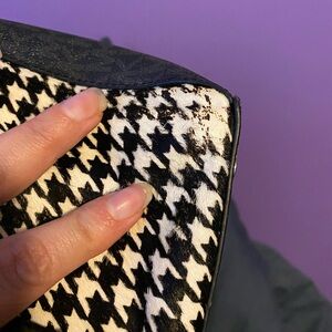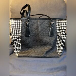 This elegant Michael Kors tote showcases a striking black and white houndstooth pattern, complemented by sleek black leather trim. Its structured design and spacious interior make it perfect for both professional and formal occasions.