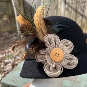 Women's black wool bucket hat with feather flower on a side one size