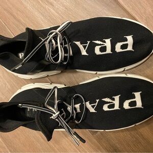 • Sustainable sneakers crafted from recycled nylon, featuring minimalist aesthetics and subtle Prada branding.