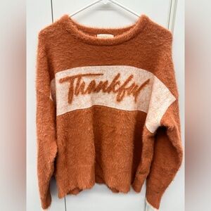 Stay warm and stylish with this cozy orange sweater featuring a 'Thankful' design. Perfect for adding a touch of gratitude to your wardrobe. Great for fall and Thanksgiving. New without tags. Never worn. Large. Fits a 16-18.