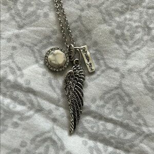 This stunning silver necklace features a detailed wing charm alongside a pearl-accented charm, and a Psalm 91:4 charm.