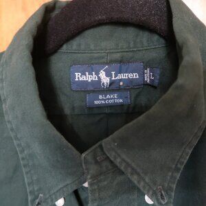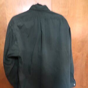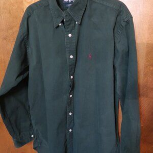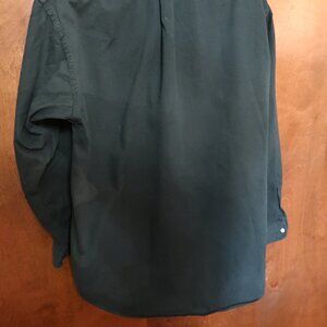 This listing is for a Ralph Lauren Men's Long Sleeve Casual Button Down Shirt in Size Large. The color is Forest Green and the fabric is a nice, heavy 100 percent cotton with a soft denim-like feel. The buttons are white and the Ralph Lauren logo is embroidered in a maroon/brown color thread. The arm pit to arm pit measurement is 25 inches and the length from the back neck seam is 33. Although pre-owned, this shirt is in excellent condition. While not like new with some signs of minor wear, there are no major signs of wear such as stains, rips, or tears. Please see photos. If you have any further questions, please e-mail.