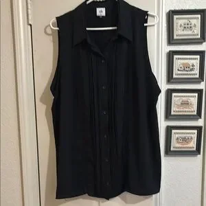 This black sleeveless top from CAbi features a notched collar and a boxy, buttoned design. Gently used and in new condition