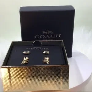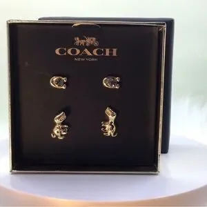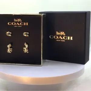 Coach earrings set featuring mascot REXY and the classic Coach ‘C’ with blue stone.