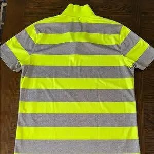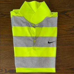 Nike Golf polo shirt with neon yellow and gray stripes. Features a classic collar and button-up front. Ideal for sporty style. Like new condition, smoke and pet free home.