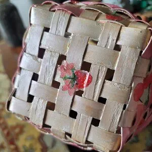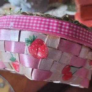 Strawberry Basket with Pink Ribbon & twine with leaves around the rim. Wicker