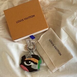 Vibrant Louis Vuitton keychain featuring an eye design. Includes black, green, orange, and pink accents. Comes with LV charm and keyring. Brand new. Plastic covering still on as well as tag. Comes with box and dust bag. Very unique item.