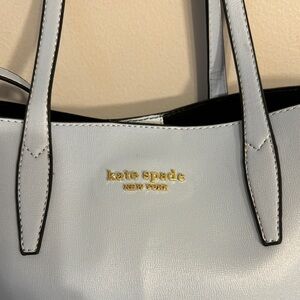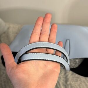 This elegant light blue tote bag is perfect for any occasion. Its sleek design and spacious interior make it a must-have accessory. This bag is used. There are some fold marks from how it was stored previously. There are marks marks on the exterior and on the bottom of the bag. There may be other callouts I may have missed.