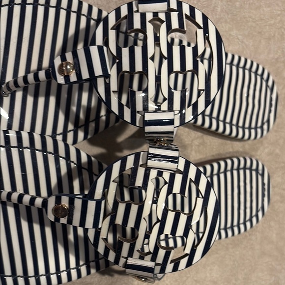 Stylish Tory Burch sandals with black and white stripes. Features iconic logo design. Perfect for casual wear.Light wear, great condition.