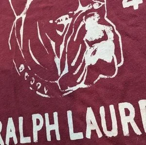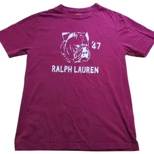 Polo Ralph Lauren tee in burgundy. Bulldog logo graphic distressed design. Slightly faded but very good used condition. Boys medium 10/12, 100% cotton.