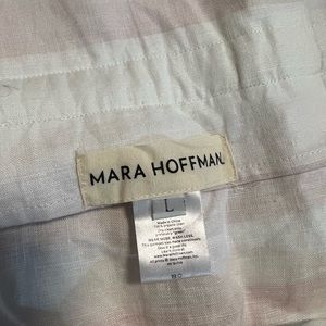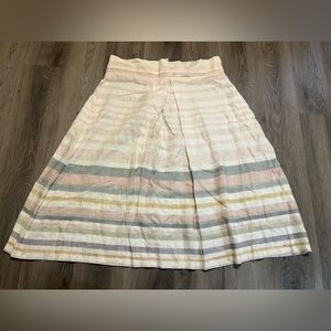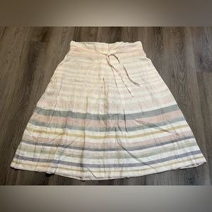 Linen midi skirt with pastel stripes & pockets by Mara Hoffman. Features a high waist and tie paper bag shape. Super comfy, just a little too big on me