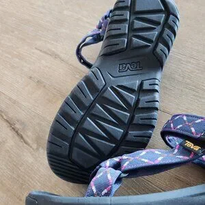 Like new, Women's Teva Hurricane XLT2 Sandal. Only worn one time. Size 9. Black soles, purple and navy geometric straps.