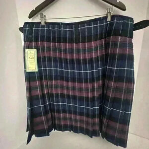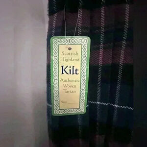 Purple and black tartan design. Gorgeous pleating. Lines inside at waist for comfort. Authentic Scottish kilt, purchased in Scotland. A standout.