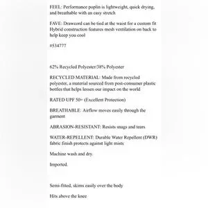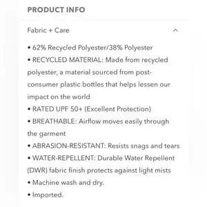 RECYCLED MATERIAL: Made from recycled polyester, a material sourced from post-consumer plastic bottles that helps lessen our impact on the world RATED UPF 50+ (Excellent Protection)