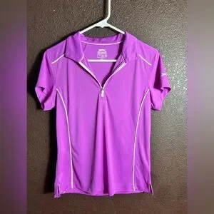 Stylish violet golf shirt with sleek white trim. Comfortable and sporty design.