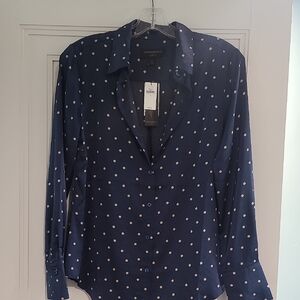 Stylish navy button-up shirt with white polka dots. Perfect for casual or formal occasions.
