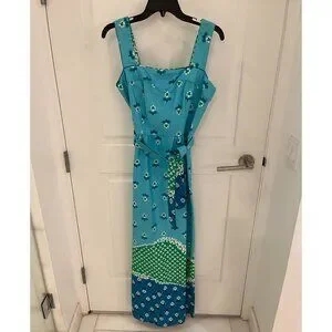 Vintage Malia Honolulu Hawaiian Summer Blue Retro Floral Design Maxi Dress with removable belt and back zipper.