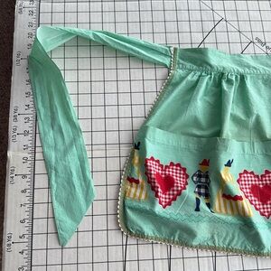 Vintage 1950s Novelty Apron – Mint Green with Gingham Hearts & Folk Dancers – Retro Kitchen Decor