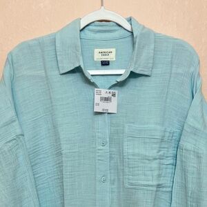 New with tags American Eagle Go Big Oversized Shirt. ⭐️Color: Blue ⭐️Lightweight & breezy woven cotton ⭐️Long sleeves with roll-and-button-up cuffs ⭐️Button-up front with left chest pocket ⭐️Collar ⭐️Curved hem ⭐️Oversized fit: baggier for a relaxed & roomy fit ⭐️Longer length: hits most below waistband ⭐️100% Cotton ⭐️Imported ⭐️Approximate measurements: -Pit to pit 27 1/2” -Length 28 1/2” -Arm length 14 1/2”.