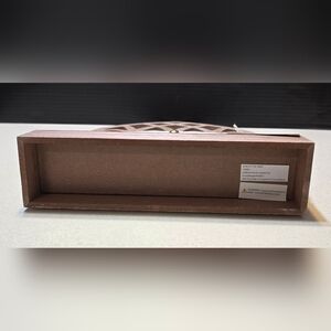 This elegant decor accent features a Gothic cathedral window design with a rustic farmhouse style, crafted in a white and brown color palette. The intricate lattice pattern and decorative script add a touch of sophistication to any space.