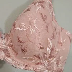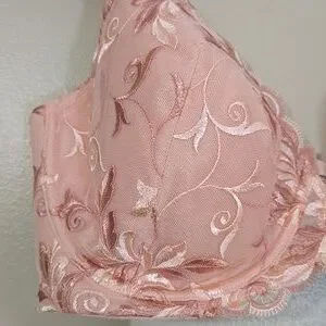 Chic peach bra with intricate lace embroidery. Offers both elegance and support. Ideal for daily comfort.