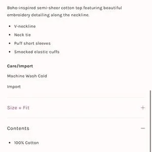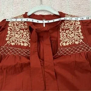 Pretty burnt orange blouse featuring a neck tie, v neck, floral embroidery, smocked puff short sleeves, and a raw hemline. No materials tag. 100% cotton. Color closest to last photo. Boxy Fit.