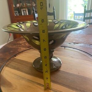 Elevate your dining experience with this exquisite serveware piece, featuring a harmonious blend of green and black tones. The handcrafted design showcases a sophisticated, flowing form with a smooth finish, perfect for formal dining occasions. Its elegant, bowl-like shape with flared edges adds a touch of artistry to any table setting. Small chip as seen in picture along bottom rim, not noticeable when displayed