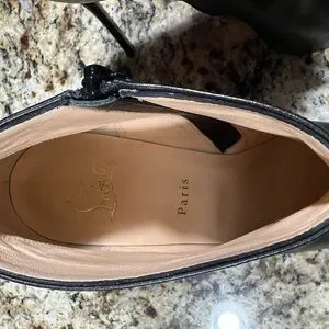 DIRDIBOOTIE 130 CALF • Elegant black leather booties with signature red soles. High stiletto heel for a striking look. Side zipper for easy wear • Brand New with dust bags, additional heel caps, and box • size 40.5 • fits US size 8.5/9 •