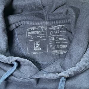 The product is a women's navy blue pullover hoodie by Patagonia in size large. Made of cotton material, this hoodie features a long sleeve, pullover closure, and is designed for activewear occasions. The hoodie is adorned with the P-6 logo, making it a stylish and classic statement piece. It also includes a hood and pockets, adding practicality to its design. Perfect for outdoor activities or casual wear, this hoodie combines comfort and style effortlessly.