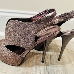 Worn once- Excellent condition! They are pale purple/silver metallic shade! Beautiful!!! These stunning glitter heels from Charlotte Russe feature a high stiletto design and a chic peep-toe style, perfect for adding a touch of elegance to any formal occasion. The vibrant pale purple/silver color and sleek silhouette make them a standout choice for evening wear.