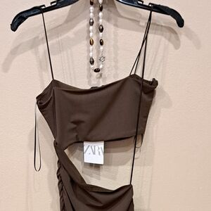 This elegant brown dress features a stylish ruched design, perfect for any occasion. Its sleek silhouette and rich color make it a versatile addition to your wardrobe.
