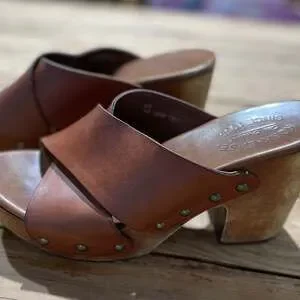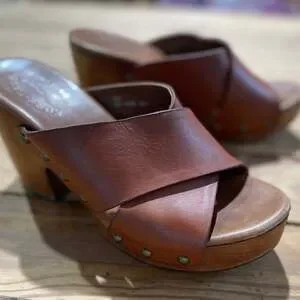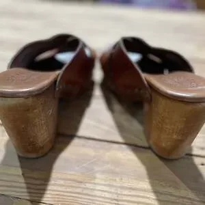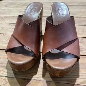 Kork-Ease Lawton Clogs in brown leather, women's size 7.5. These vintage-inspired mules feature a comfortable criss-cross strap design and a sturdy wooden platform and heel. Excellent pre-owned condition with slight wear on the wooden base consistent with normal use, as shown in photos. No major flaws or damage. Perfect for adding a touch of boho or retro style to any outfit. Made with quality leather and craftsmanship.