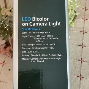 Contains: 144 dual color LED light, Metal hot shoe adapter, Diffusion panel & carrying case